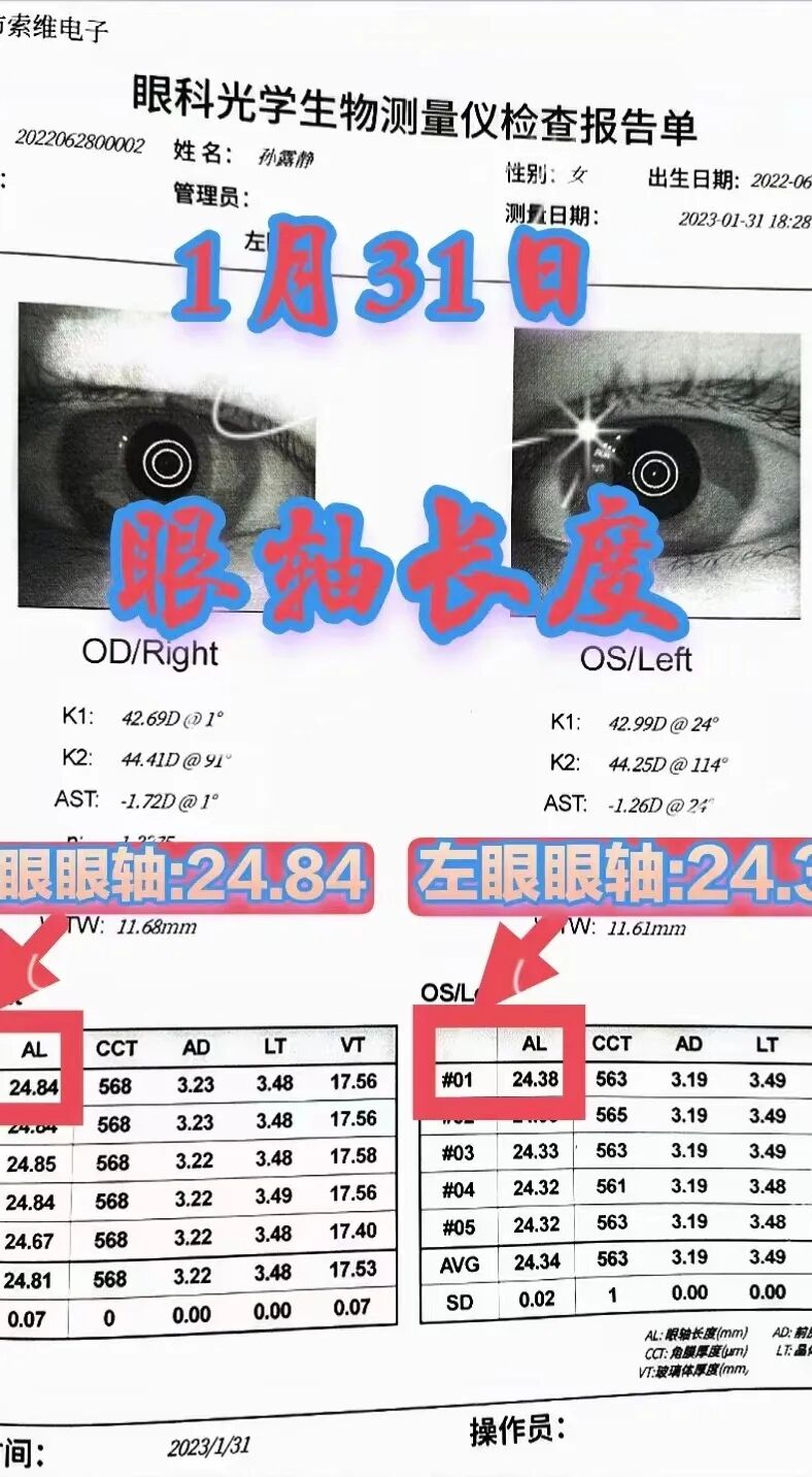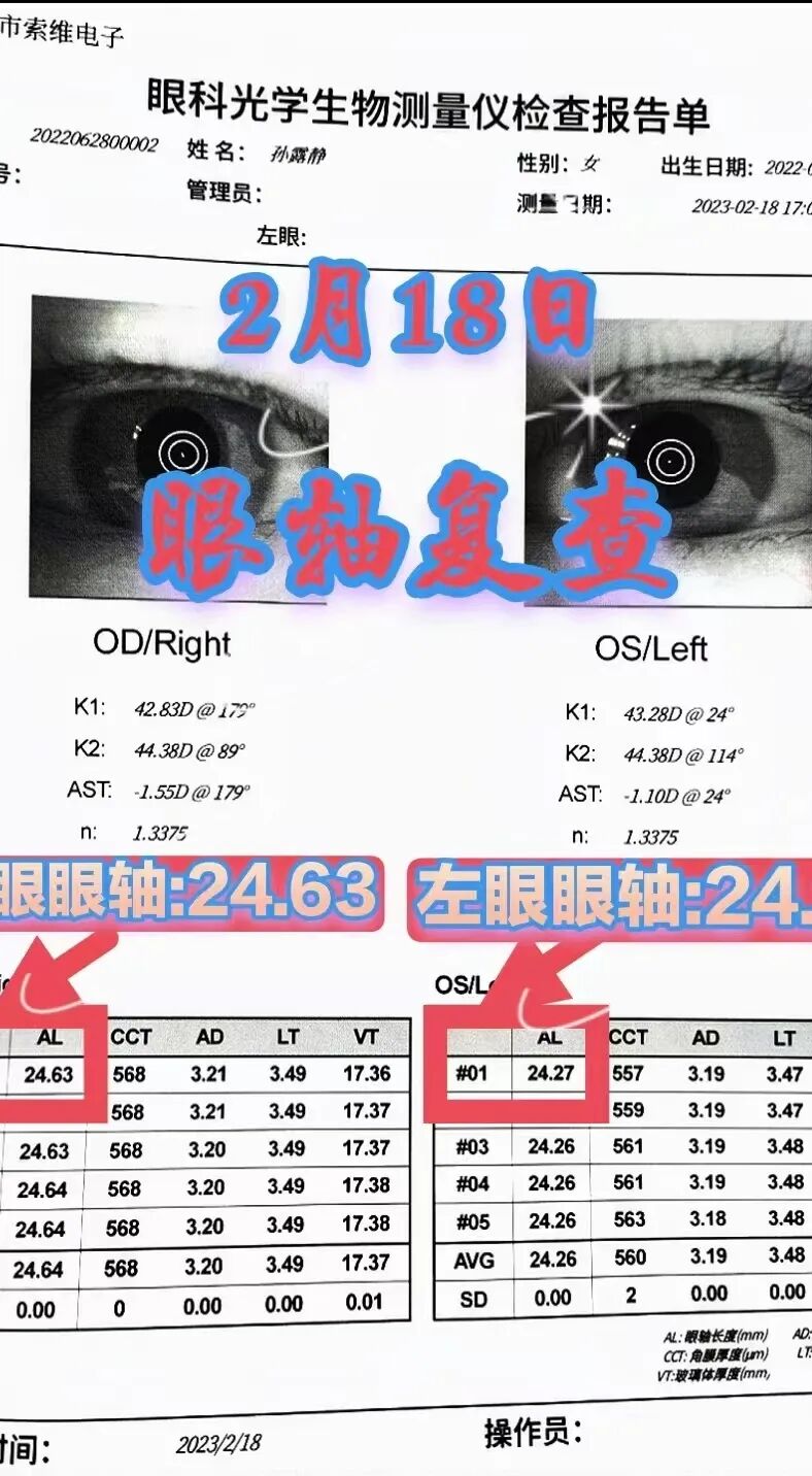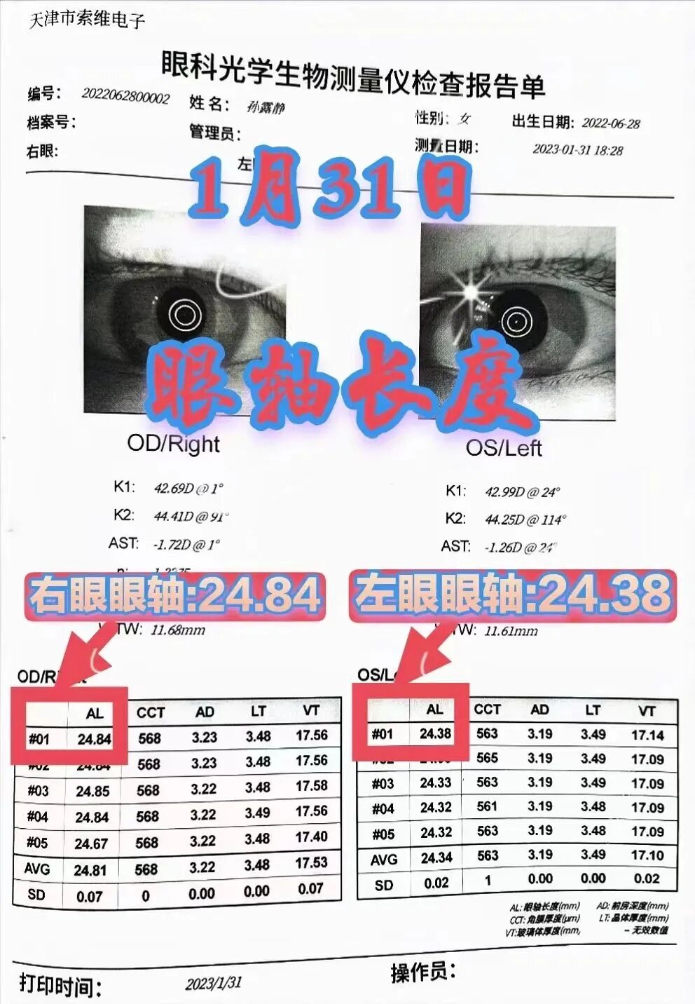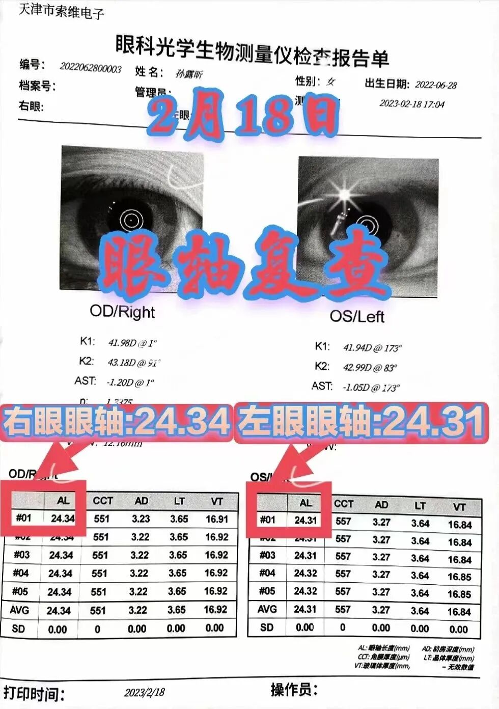 孙同学11岁,佩戴新零度乐视控眼镜,结合视功能训练,使用童视康哺光仪,对比前后很明显,右眼眼轴回退0.04,左眼回退0.04。并且裸眼视力也得到了提升。恭喜