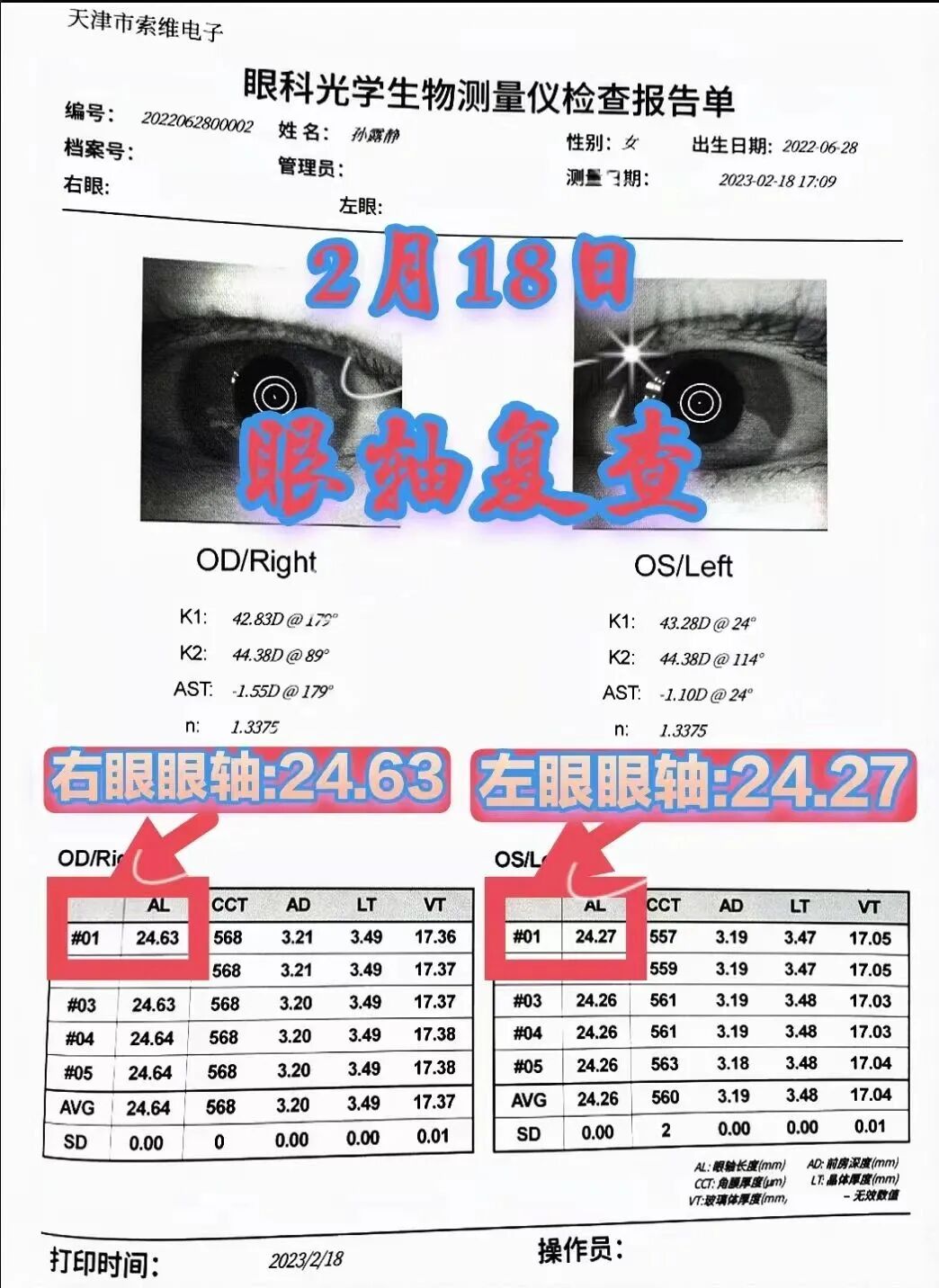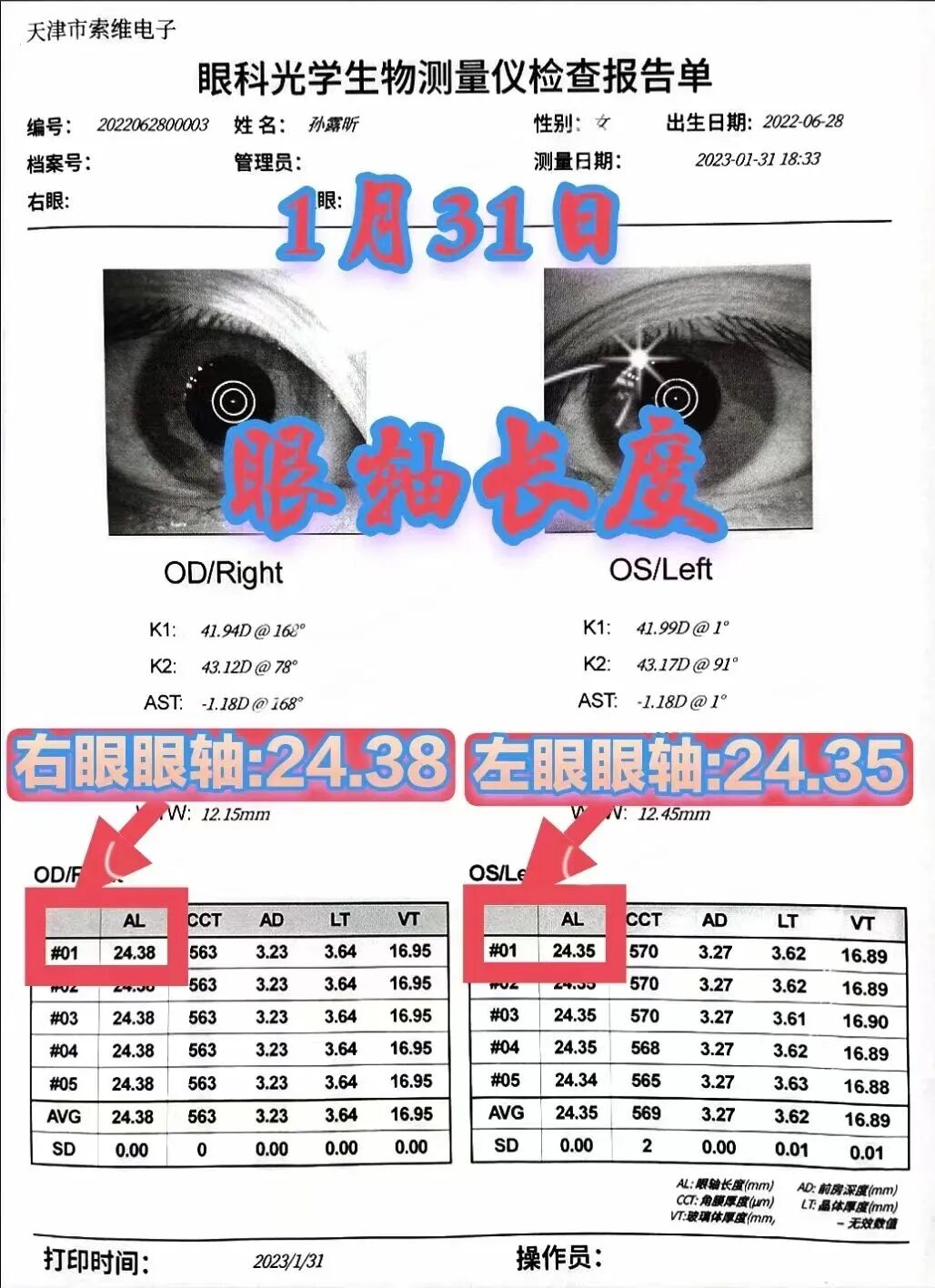 孙同学12岁,佩戴新零度乐视控眼镜,结合视功能训练,使用童视康哺光仪,对比前后很明显,右眼眼轴回退0.21,左眼回退0.11。并且裸眼视力也得到了提升。恭喜